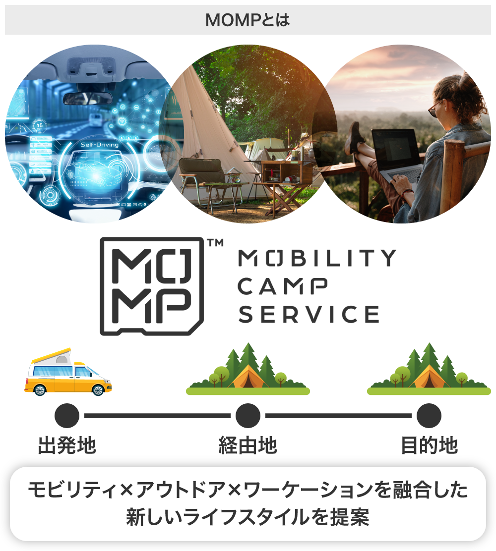 弊社は、こういった新しいアウトドアレジャーやライフスタイルのニーズに応えるとともに、自動運転普及やMaaS実現によって大きく変わる未来を見据え、車中泊やバンライフを発展させた快適性重視の「モビリティ×キャンプ」サービスである「MOMP」を提供することを目指します。
