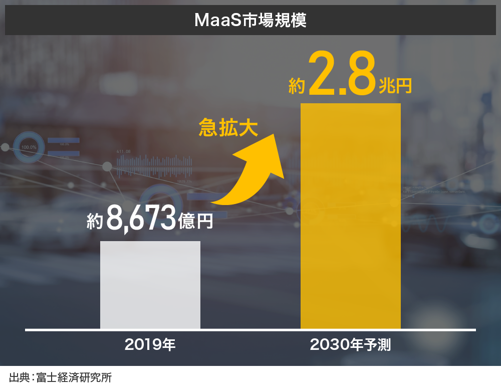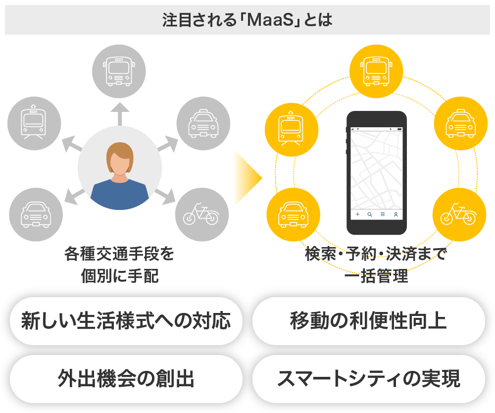 さらに数十年先の未来には、車の自動運転や、電車・バス・タクシー・シェアカー・シェアサイクルなどの様々な交通手段の検索・予約・決済を一元化した交通サービス(MaaS)の普及が想定されており、国土交通省や経済産業省などを中心に、実現化に向けた取り組みが進められています(出典:国土交通省)。