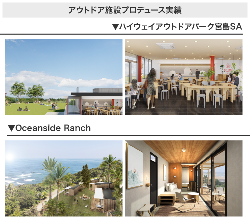 大阪難波のBBQパーク、宮島SA(サービスエリア)の芝生広場のアウトドアパーク、宮崎市のオーシャンビューのグランピング施設など、多様なプロジェクトを展開しています。
