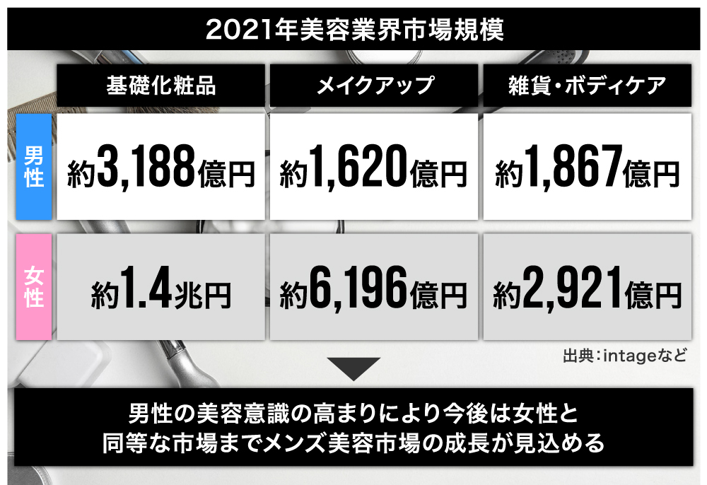 2021幎çºè¡šã®çŸå®¹ã«é¢ããæè調æ»ã«ãããšã20ïœ30代ã®ç·æ§ã®åæ°ä»¥äžãã¡ã³ãºçŸå®¹ã«é¢å¿ããããšããããŒã¿ããããŸãïŒåºå žïŒçŸå®¹ã»ã³ãµã¹ïŒããã®èæ¯ã«ã¯ã女æ§ã®ç€ŸäŒé²åºãé²ãã ããšã§ããèŠãç®ããæ°ã«ããç·æ§ãå¢ããŠãããªã©æ§ã ãªèŠå ãèããããŸãã