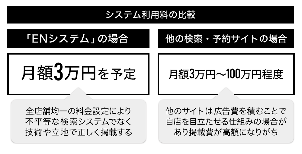 ã·ã¹ãã å©çšæã¯æé¡çŽ3äžåïŒçšå¥ïŒãæ³å®ããŠããŸããããã¯ä»ã®æ€çŽ¢ã»äºçŽãµã€ããšæ¯èŒããŠãå®äŸ¡ãªèšå®ã«ããããšã§ãè²»çšé¢ã§ãå€ãã®ã¡ã³ãºçŸå®¹ãµãã³ã«åãå ¥ãããããšèããŸãïŒèªç€Ÿèª¿æ»ã«ããïŒã