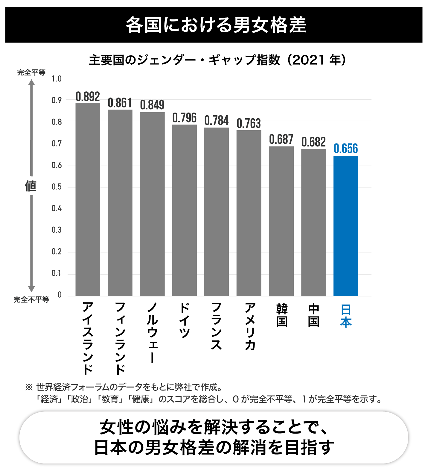 日本では依然として、女性が社会の中で不利な立場に置かれてしまうことも少なくありません。世界経済フォーラムが公表した「ジェンダー・ギャップ指数2021」によると、日本の男女格差度指数は156か国中120位で、先進国の中で最低レベル、アジア諸国の中で韓国や中国より低い結果でした。