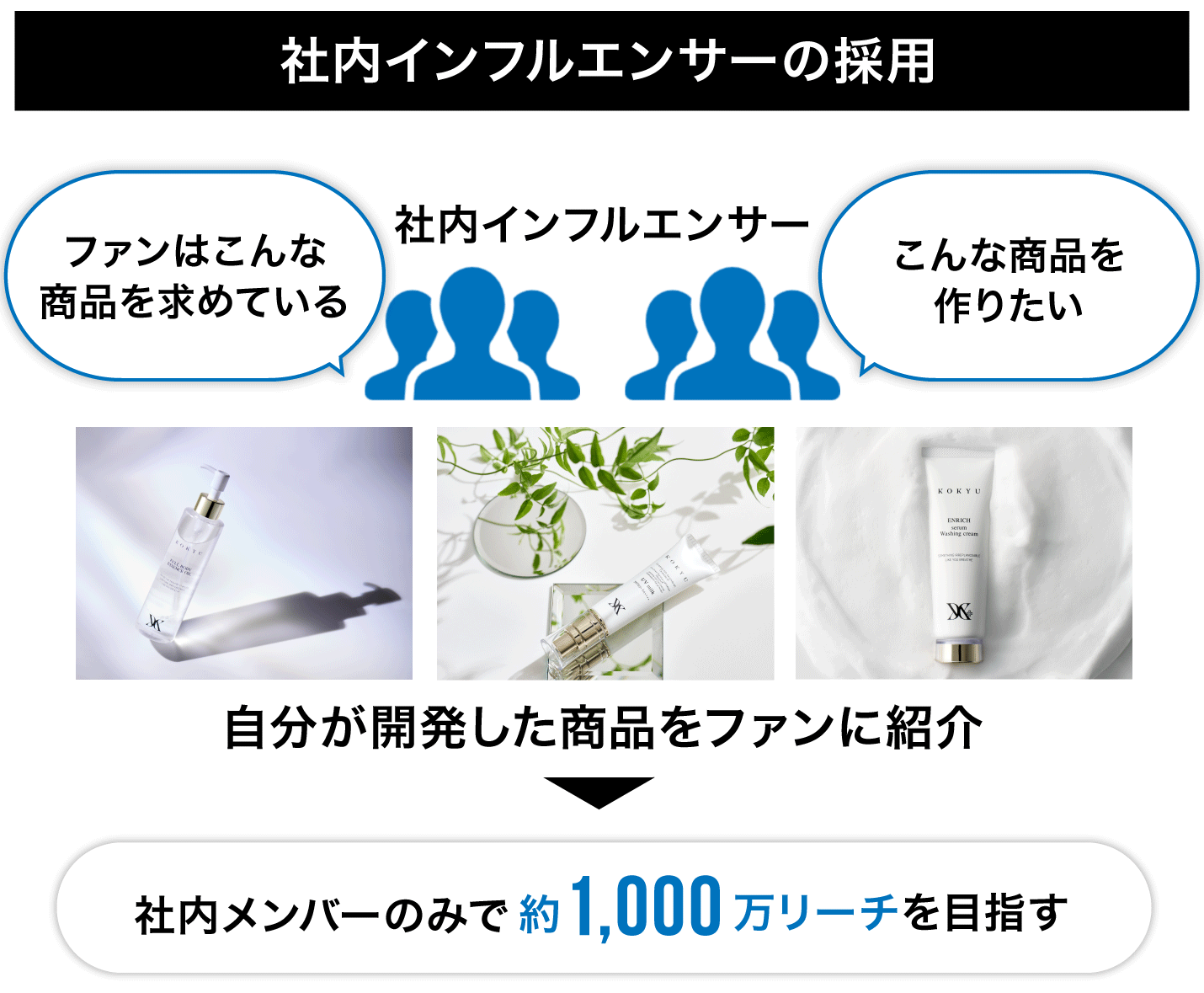 といった理念に共感いただいたインフルエンサーの方を社員として採用し、自分の開発した商品やKOKYU商品をそれぞれが持つインフルエンス力で販路を広げています。