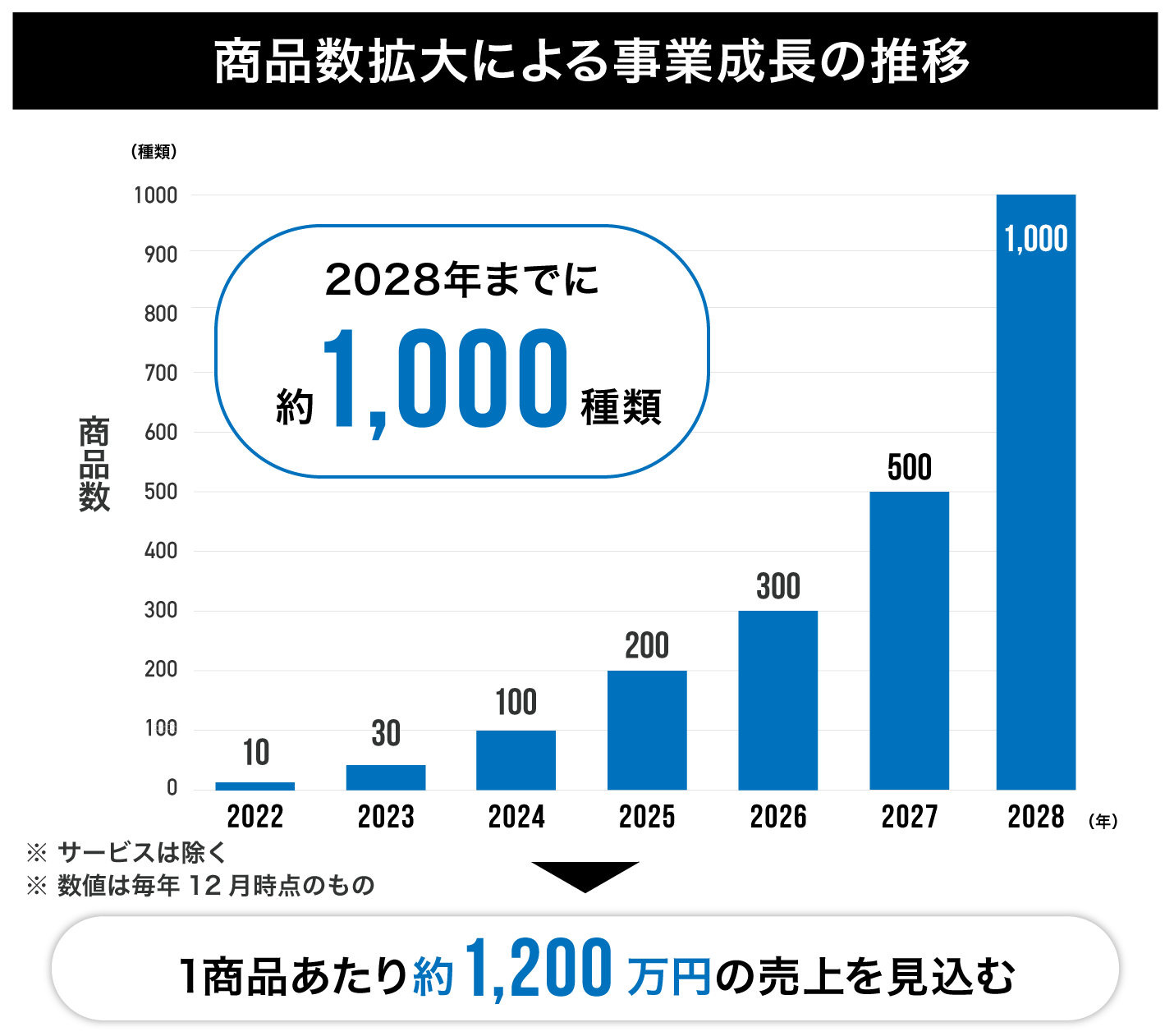 1商品あたり年間約1,200万円の売上が可能だと試算しており、商品数が増えるごとに弊社の事業規模も拡大する計算です。