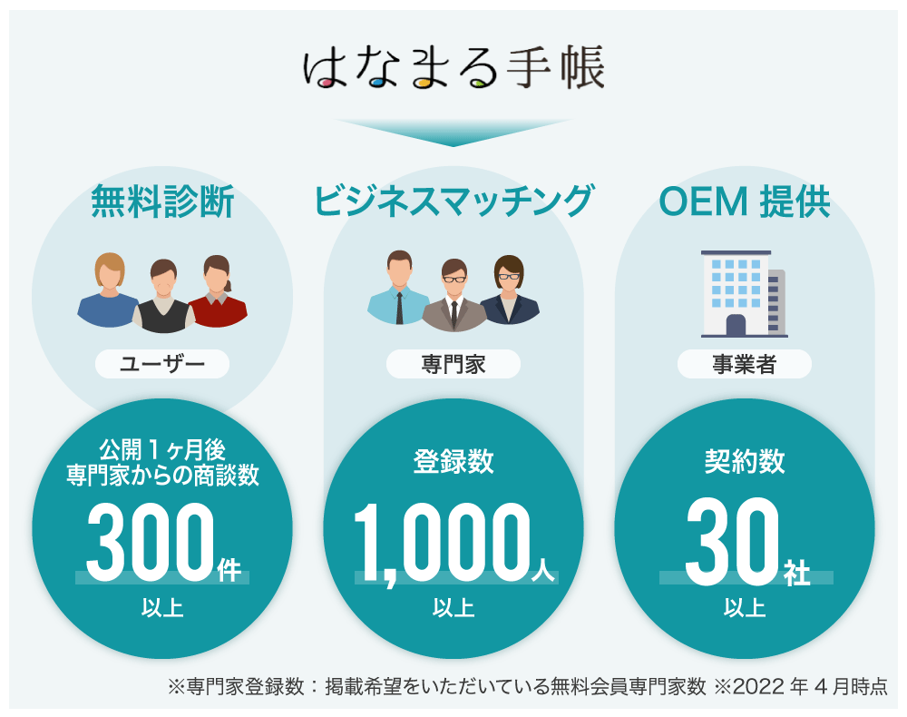 「はなまる手帳」には、資格チェックを経た1,000人以上の専門家が登録しており、専門家同士をマッチングして異業種連携を支援する場でもあります。さらに、これまでオフラインで相続や保険に関する相談会を実施してきた銀行や企業に「はなまる手帳」のシステムをOEM提供することで、ワンストップの相続・終活相談のオンライン化が実現できます。実際にサービスのリリース時から多くの引き合いをいただいており、効率的な集客エンジンとしての需要が全国各地に存在します。OEM提供を全国各地の企業に行うことにより、「はなまる手帳」はユーザーと専門家の両方を幅広く獲得し、より充実したプラットフォームへと成長していきたいと考えています。
