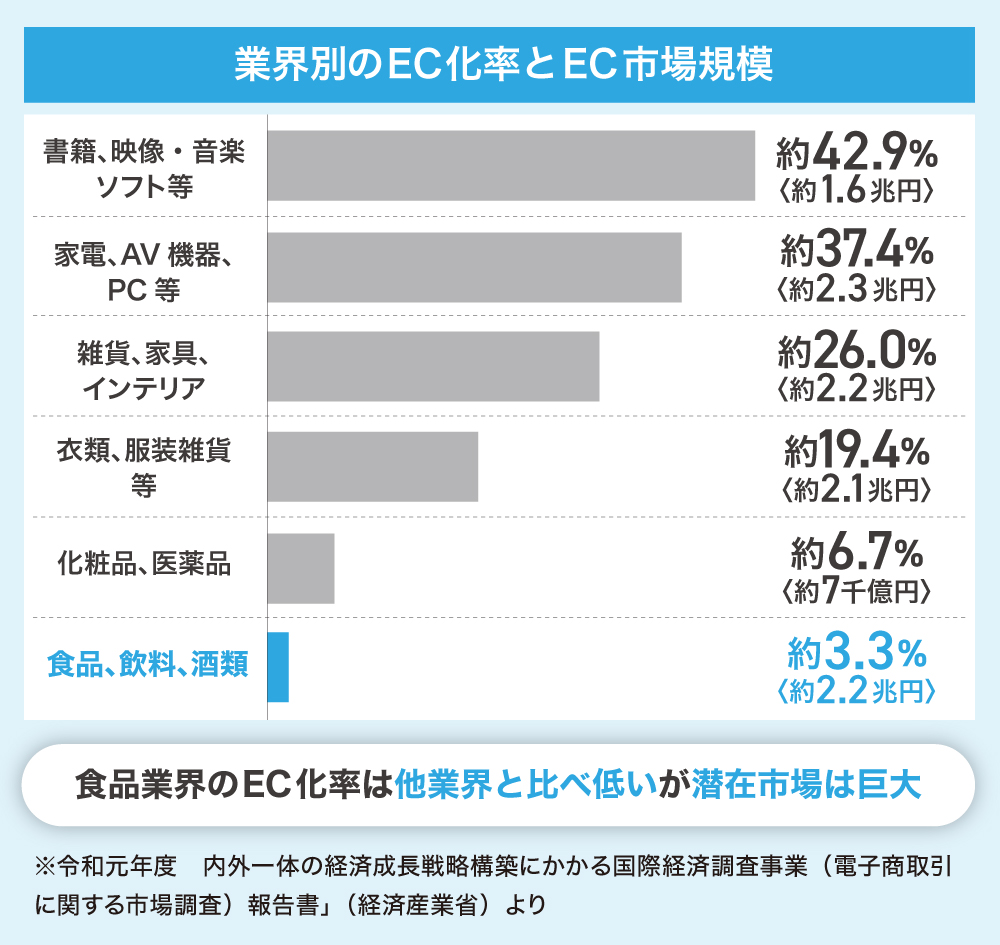 拡大を続けるEC(ネット通販)市場において、食品業界だけはECの活用が進んでいません。多くの業界ではEC化率が10%以上となっており、中には40%を超える業界もある中、食品業界のEC化率は3%ほどに留まっています。