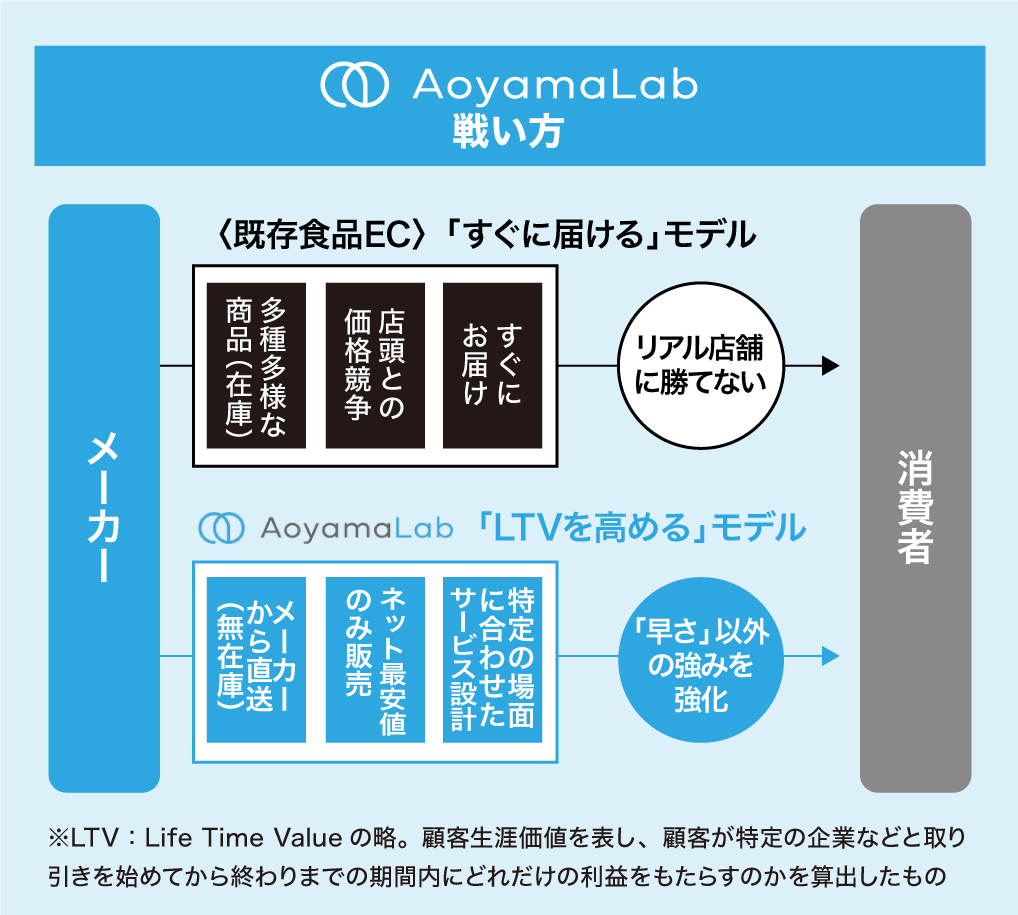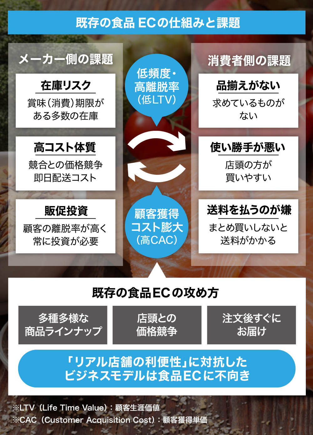 しかし、単価が低く日々ニーズが変わる飲食品をこのスタイルで取り扱うのは運営側にとって負荷が大きく、収益化は至難の業だと考えています。賞味(消費)期限があるので在庫リスクが他の商材より大きく、運営コストがかかる割にLTV(顧客生涯価値)はなかなか上がりません。