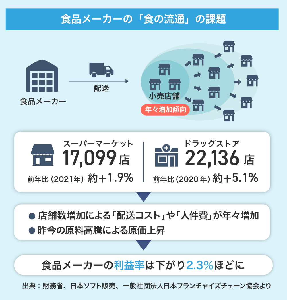 EC化率が伸び悩む一方で、食品を販売するスーパーマーケット等のリアル店舗は増え続けています。店舗数が増えることで配送先が増え、食品メーカー側からすると配送コストや廃棄リスクが増えて効率は下がります。
