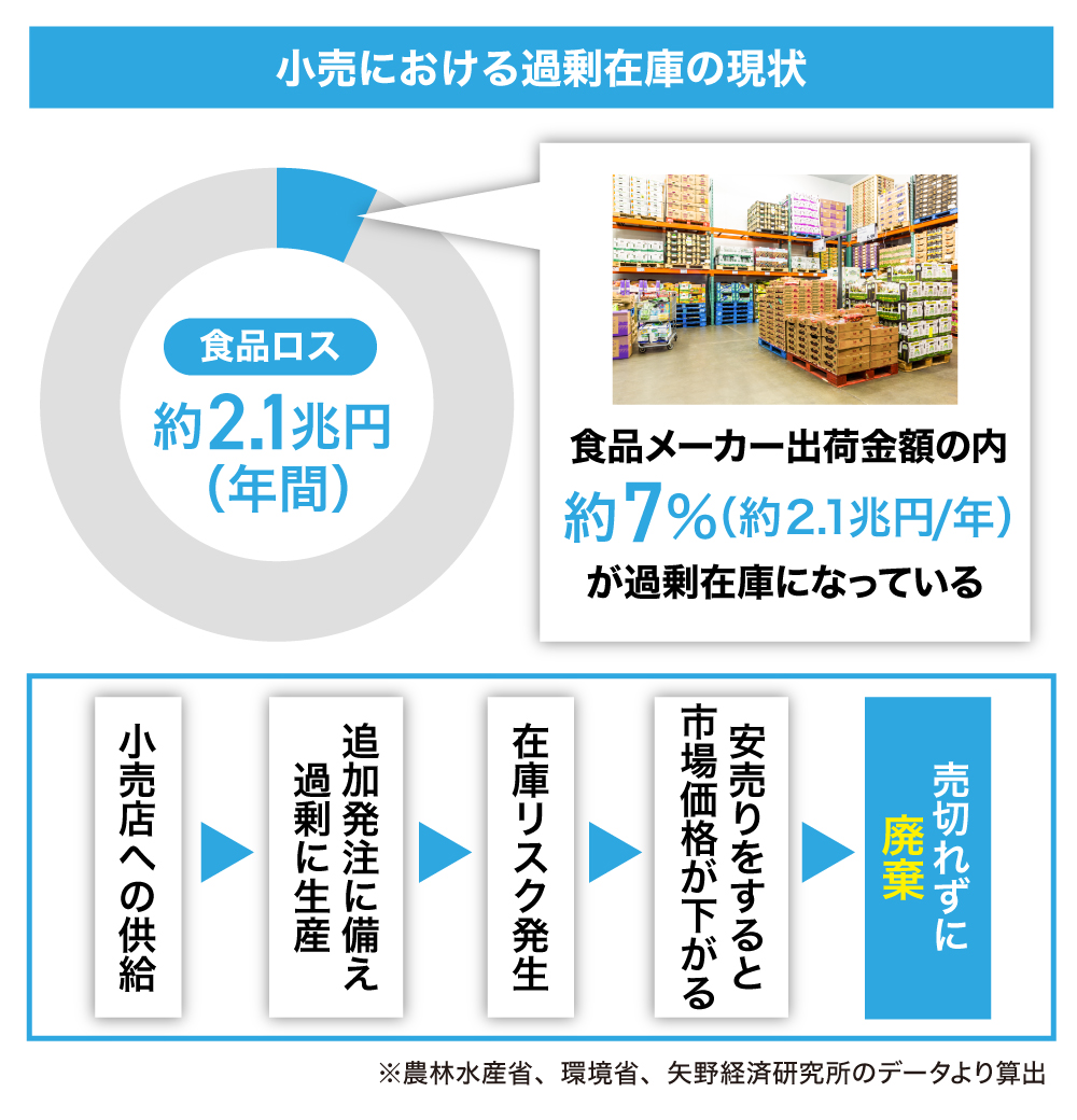 食品メーカーが生産した商品のうち、実は年間約2.1兆円分が販売されることなく廃棄されています。小売店からの追加発注に対応できず欠品してしまうと棚を他社に奪われるため、常に多めに生産する傾向が強いからであると考えています。