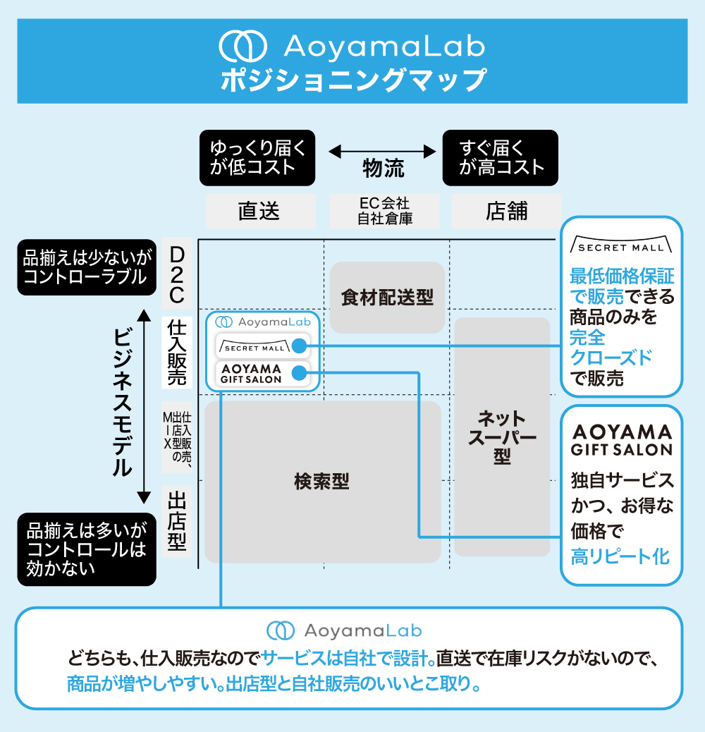 たった3%で留まっている原因とその解決方法が分かれば、一気にブルーオーシャンを開拓できると考え、朝田は業界について色々とヒアリングを重ねました。結果、賞味期限と単価の安さが最大のボトルネックであることが分かり、色々と解決策を模索し生み出したのが、今の「AOYAMA GIFT SALON」と「SECRET MALL」です。