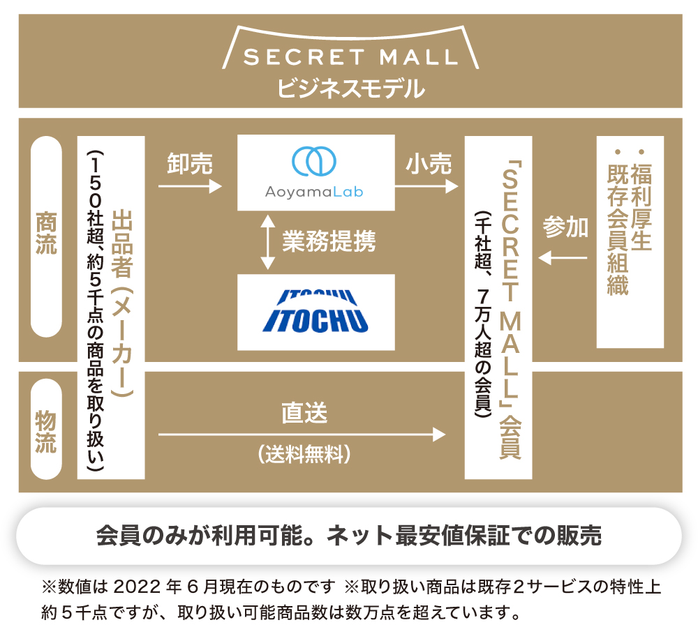 また「SECRET MALL」は、企業の福利厚生の1つとしてや、クレジットカード会員の特別会員サービスなどとして導入されているため、企業が自発的に社員や会員に向けてサービスを案内してくれます。そのため、弊社やメーカーが販促費をかける必要がありません。結果、運営コストを極めて安く抑えることができるため、メーカーも我々も利益を出しつつ販売価格を下げることが可能なのです。