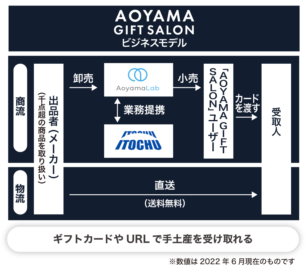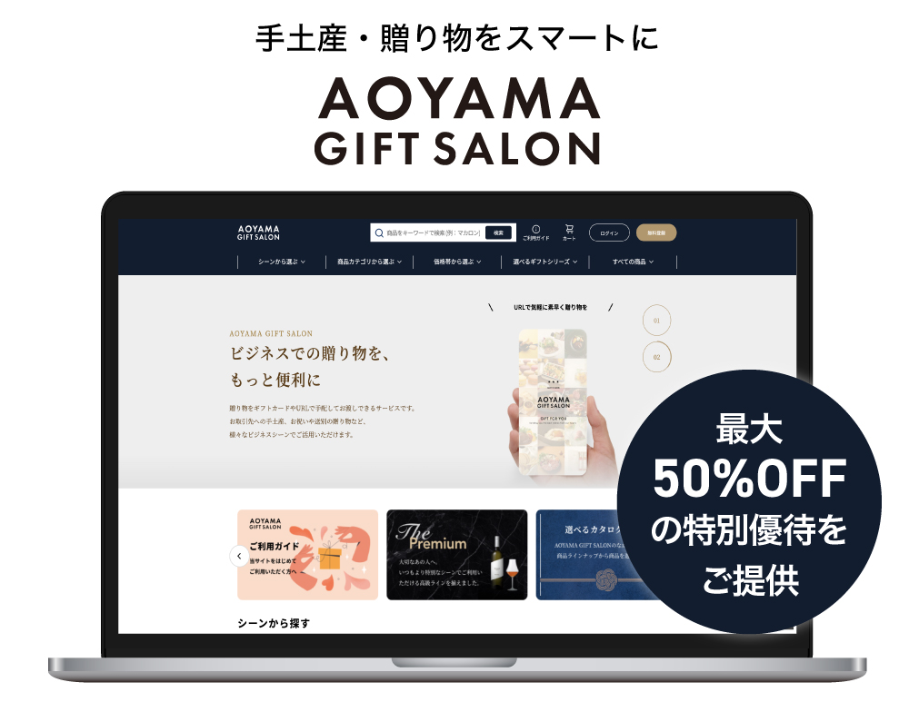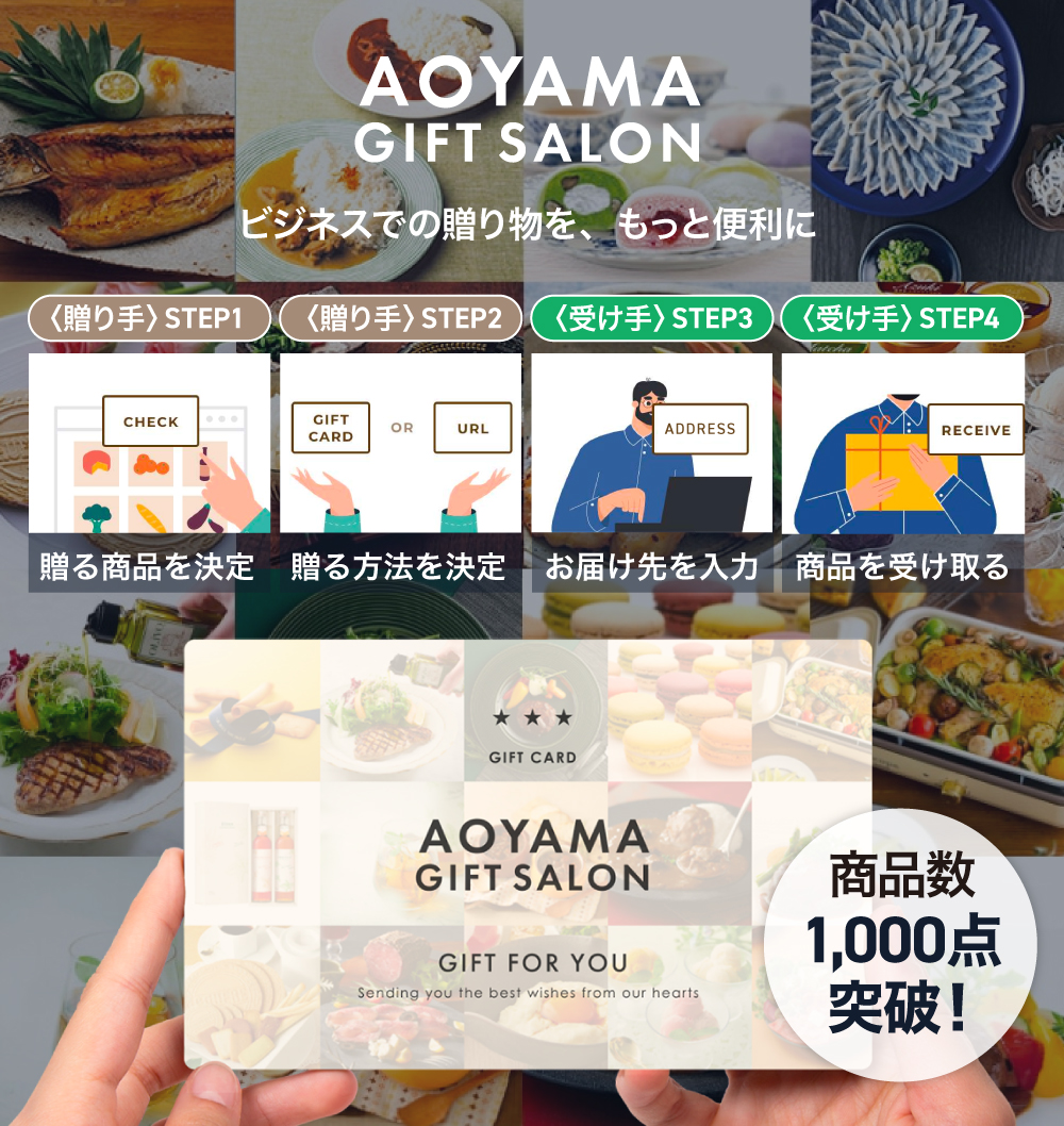 「AOYAMA GIFT SALON(アオヤマギフトサロン)」は、現物手土産の代わりにギフトカードやオンラインギフト(サービス名『リモート手土産』)を渡し、受け取った人が希望する場所でメーカーから直接品物を受け取れるサービスです。主に、ビジネス現場や会食でやり取りされる法人向け用途を想定していましたが、URLをメッセージアプリなどで送れる個人向けサービスも用意しており、個人からの購入や、さらにその利便性から法人の福利厚生や販売促進の景品としての利用も増えてきています。