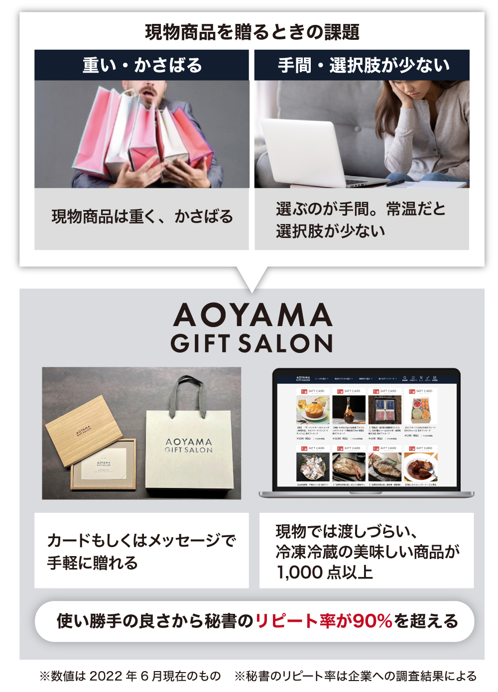 「AOYAMA GIFT SALON」は、手土産等の法人の贈り物としてギフトカードやオンラインギフトを渡し、受け取った人が希望する配送先でメーカーから直接品物を受け取れるサービスです。秘書の方には、リピート率90%以上と好評をいただいており、法人による平均購入単価は15,000円ほどと食品ECとしては高単価です(弊社調査より)。