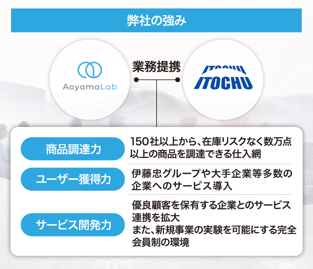 また、伊藤忠グループ約300社、及び同グループ取引先へ向けた当2事業の紹介を通して、会員獲得の面でも大きなサポートを得ています。