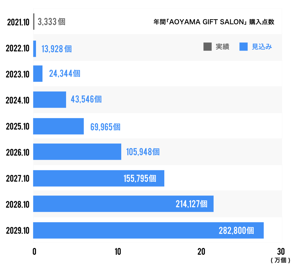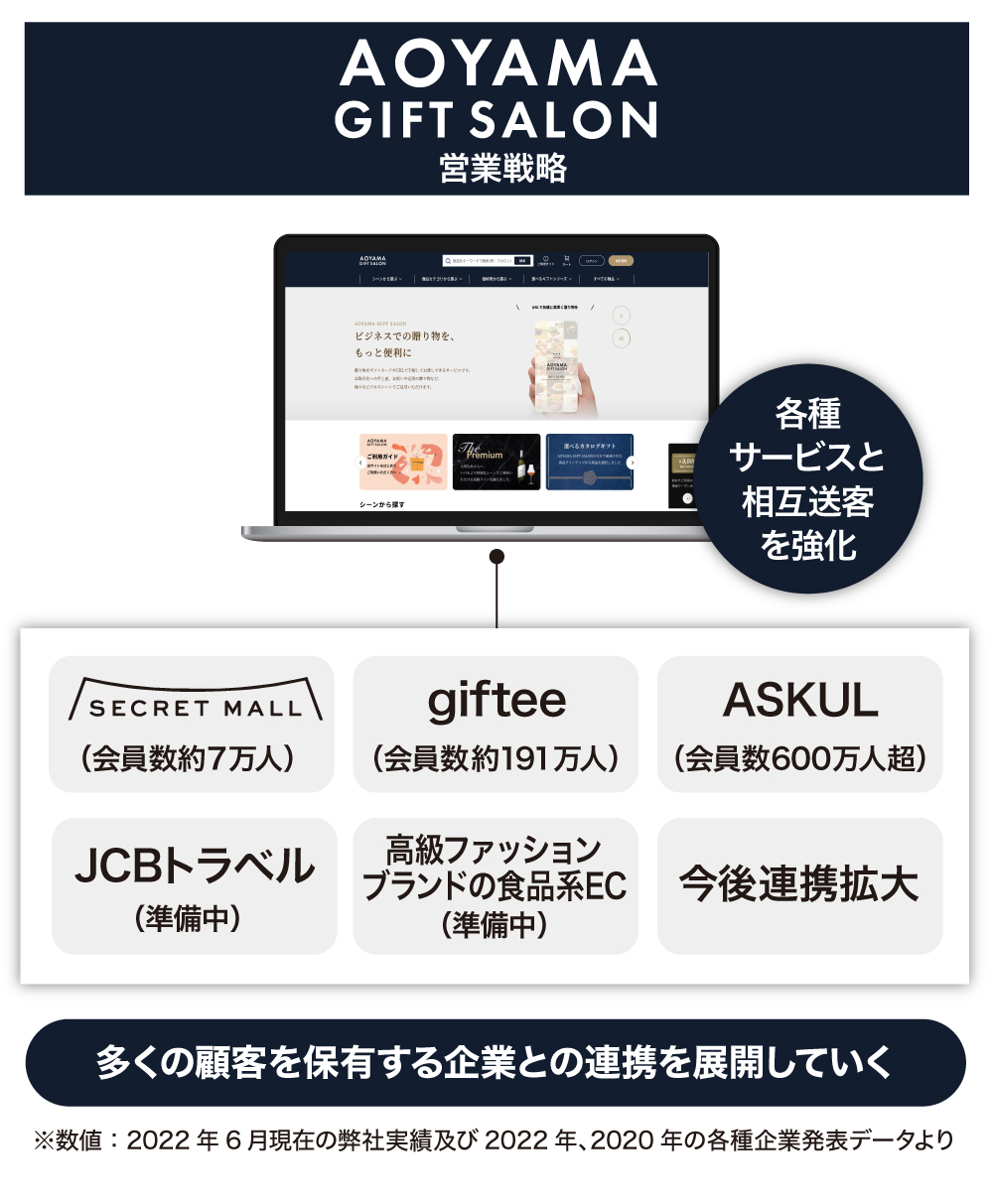 また、「AOYAMA GIFT SALON」のユーザー獲得としては、「SECRET MALL」からの送客や「SECRET MALL」内販売、giftee(ギフティ)、ASKUL(アスクル)でも既に販売しておりますが、今後、富裕顧客を抱えたJCBトラベル様や高級ファッションブランドとの連携も近々に予定しています。
