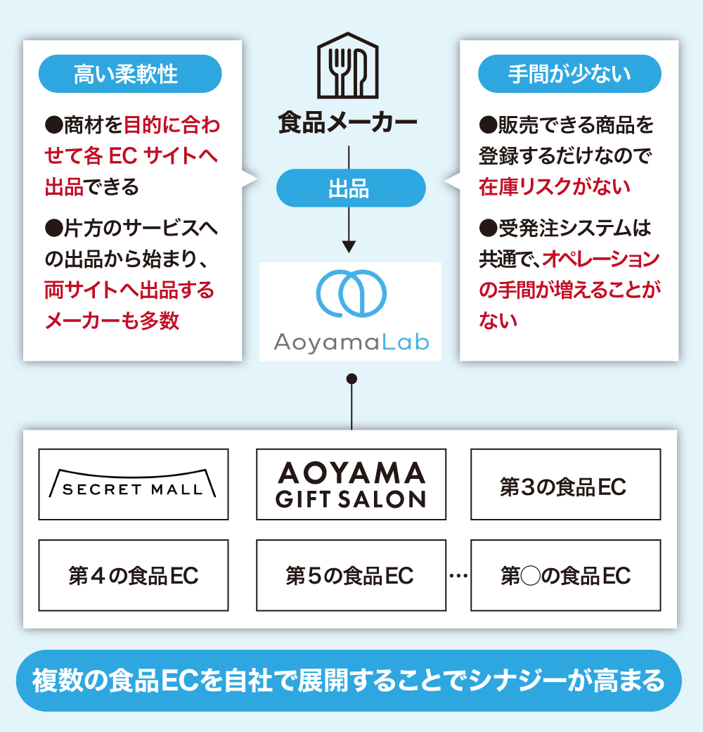 「SECRET MALL」と「AOYAMA GIFT SALON」への出品オペレーションは共通しており、食品メーカーは両サービスに簡単に出品できます。ギフト商材は「AOYAMA GIFT SALON」、ギフト商材含むあらゆる商品は「SECRET MALL」と、多くのメーカーが両方に出品しています。