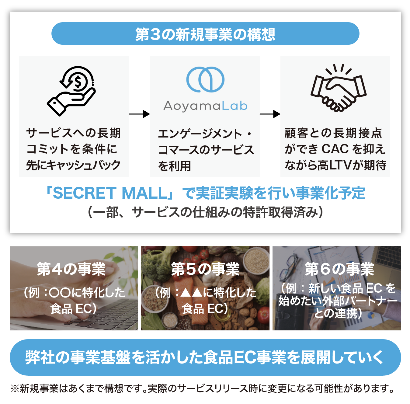 既存2事業で構築した、AoyamaLab固有のビジネスインフラを活かし、第3の事業(キャッシュバック)、第4以降の事業を自社及び外部と連携し、連続的に創出することを計画しています。