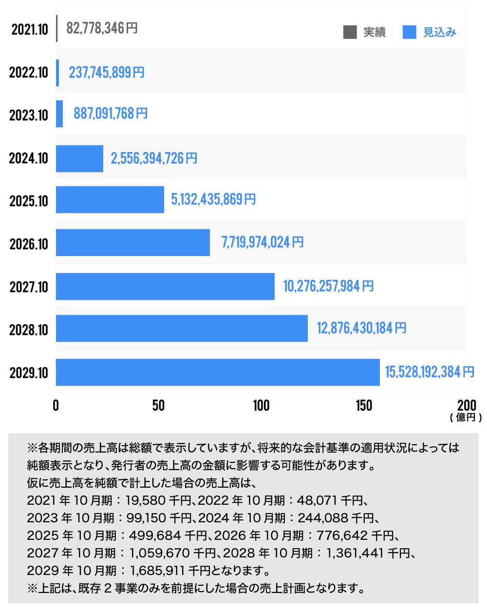 下の表は現時点において今後の経営が事業計画通りに進展した場合のスケジュールです。そのため、今回の資金調達の成否、調達金額によって、スケジュールは変更となる場合がございますので、予めご了承ください。また、売上高は事業計画を前提としており、発行者の予想であるため、将来の株価及びIPOなどを保証するものではありません。
