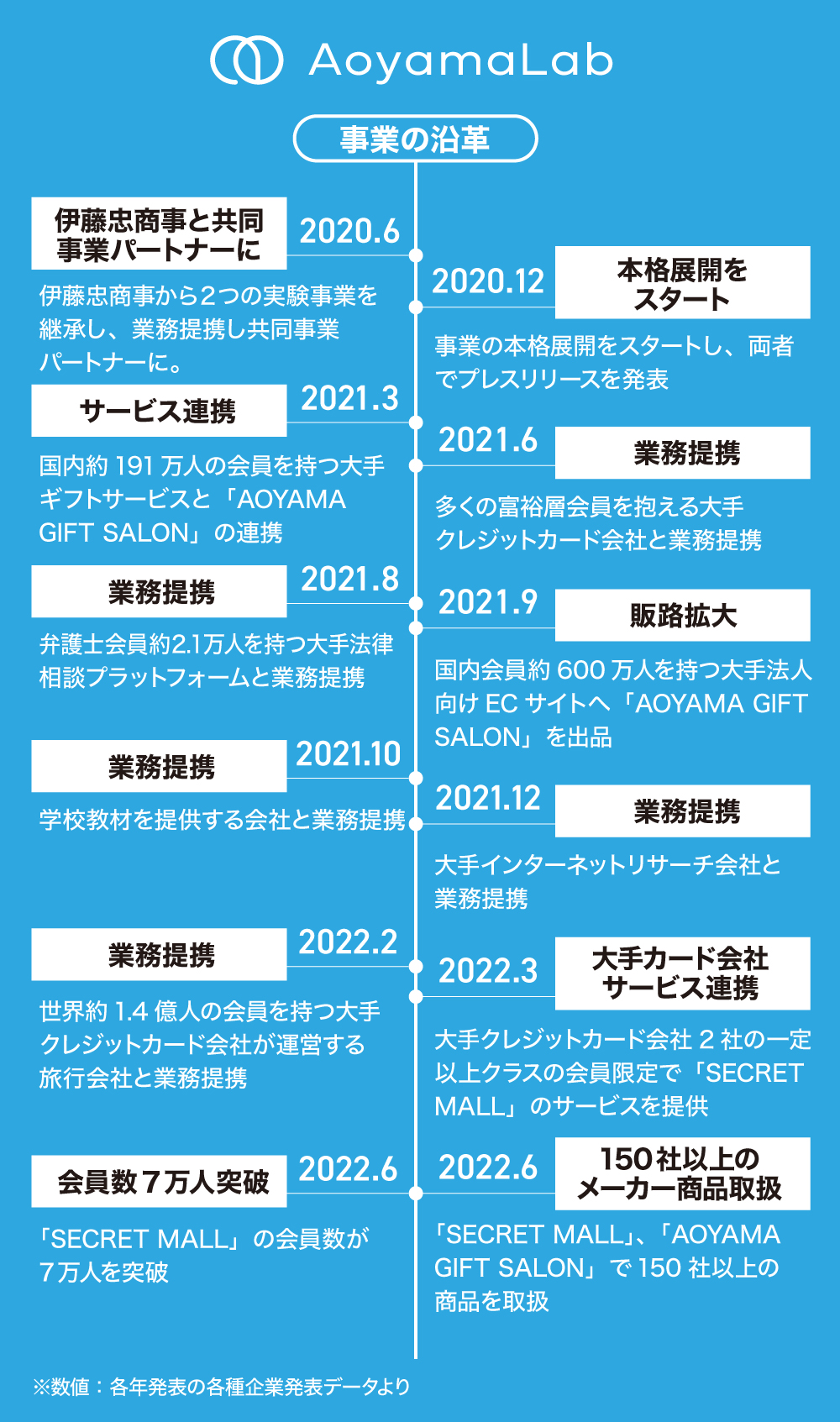 弊社事業は、大手商社の伊藤忠商事株式会社の実験事業として誕生しました。そして、当実験を継承し、同社との業務提携のうえ共同事業パートナーとなることで、150社以上の食品メーカーからの仕入れネットワークを構築し、「SECRET MALL(シークレットモール)」と「AOYAMA GIFT SALON(アオヤマギフトサロン)」の2サービスの本格展開をスタートしました(事業連携等の詳細はこちらからご確認いただけます。「こちら」から遷移するWebサイトは、FUNDINNOが作成したものではありません)。