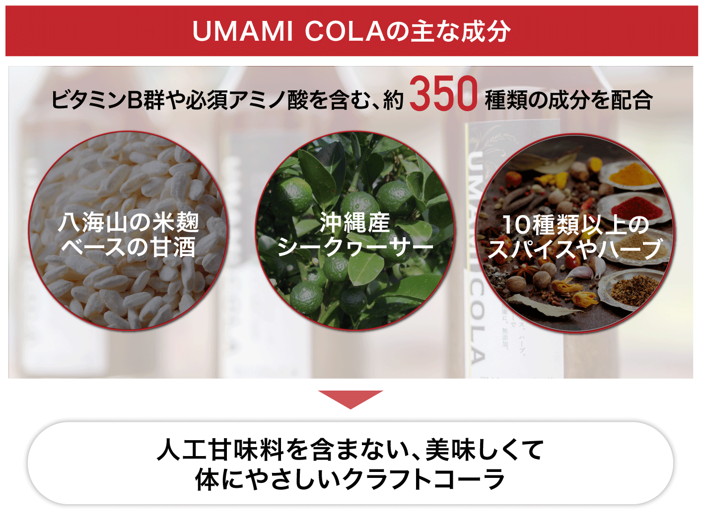 「UMAMI COLA」は、清酒「八海山」を販売する八海醸造株式会社の米麹だけで作った甘酒をベースに、スパイスやハーブ、シークヮーサーなどの柑橘類から作られる天然の「生」クラフトコーラです。ビタミンB群や必須アミノ酸9種類など、約350種類もの成分が含まれています(出典:Journal of Bioscience and Bioengineering)。