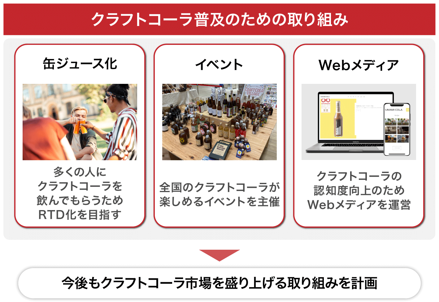このようにクラフトコーラ業界の発展を牽引してきたからこそ、弊社が先陣を切って「UMAMI COLA」をRTD化し、清涼飲料水業界に「ナチュラルドリンク」という新たな分野を構築できると考えています。