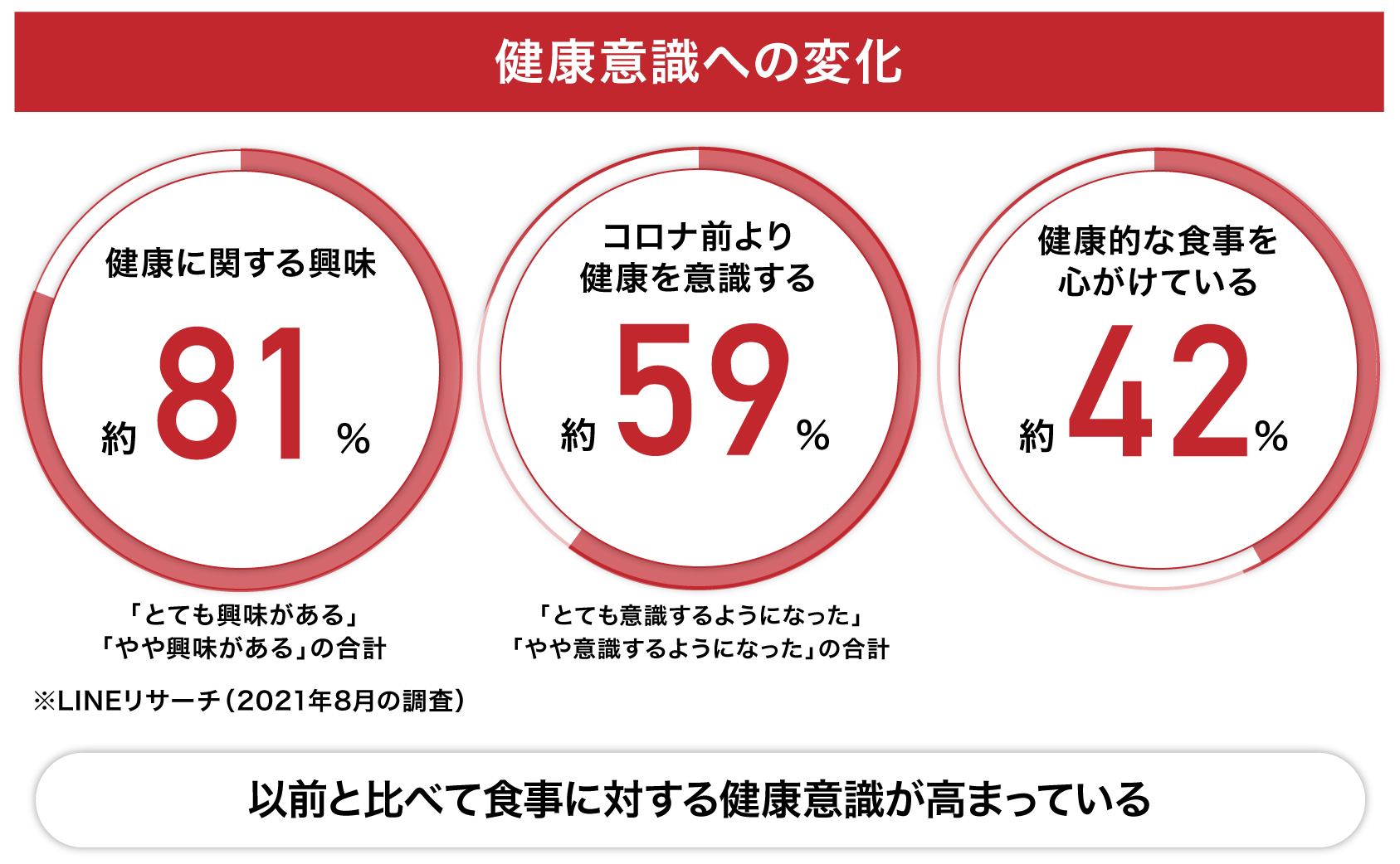 新型コロナウイルス感染症の蔓延以降、特に老若男女を問わず健康意識が高まっています。2021年8月に行われた調査の中で「コロナ前に比べて『健康』への意識変化は?」という問いに、全体の約59%の人々が「健康をより意識するようになった」と回答。その中でも「健康のために心がけていること」として約42%の人が「健康的な食事をする」ことを挙げています(出典:LINEリサーチ)。