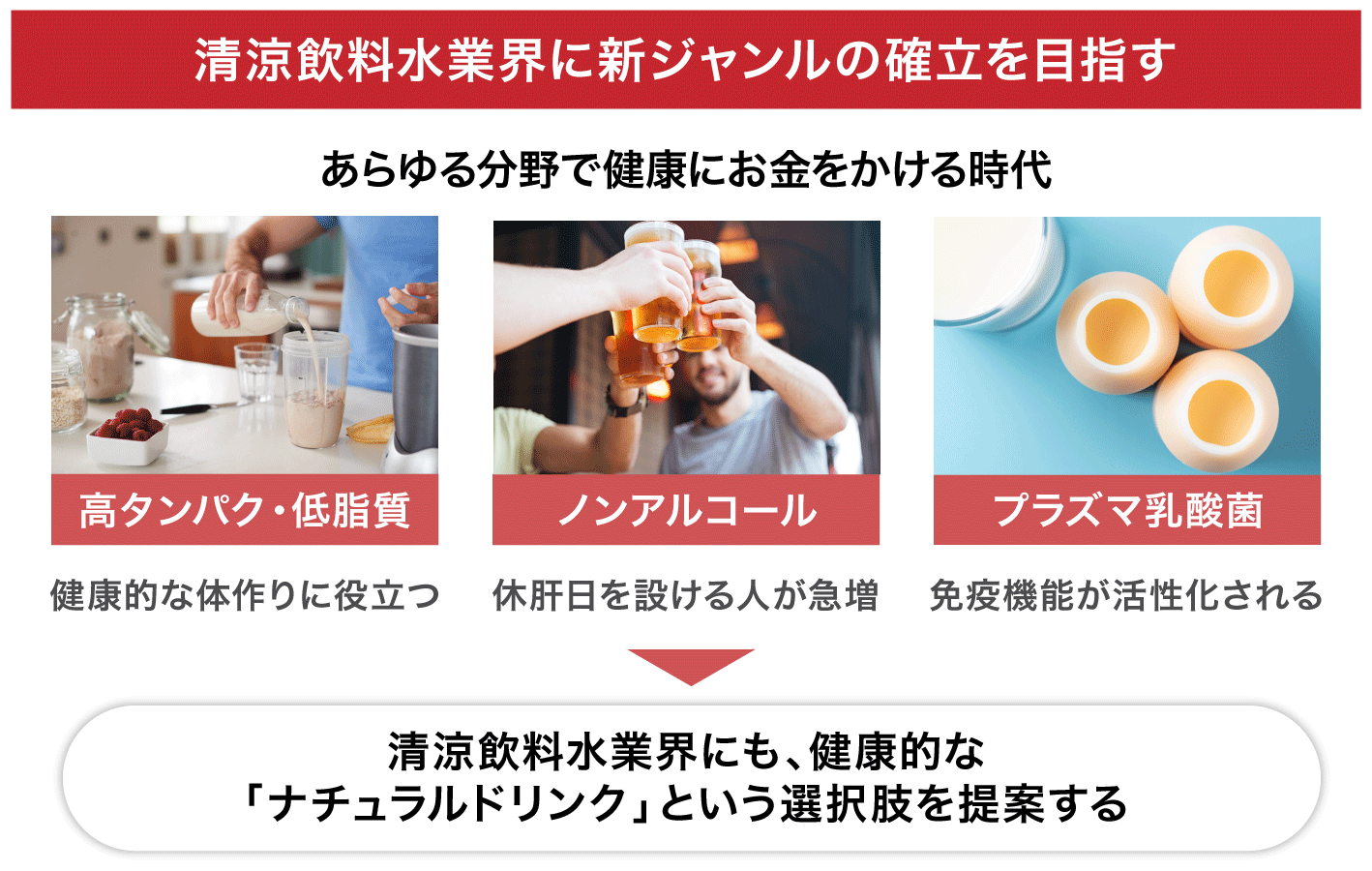 一方、清涼飲料水業界ではその選択肢がまだ少ないと考えています。そこで弊社は、健康意識が高まっている昨今だからこそ、清涼飲料水業界にも新たな選択肢があるべきだと考えています。