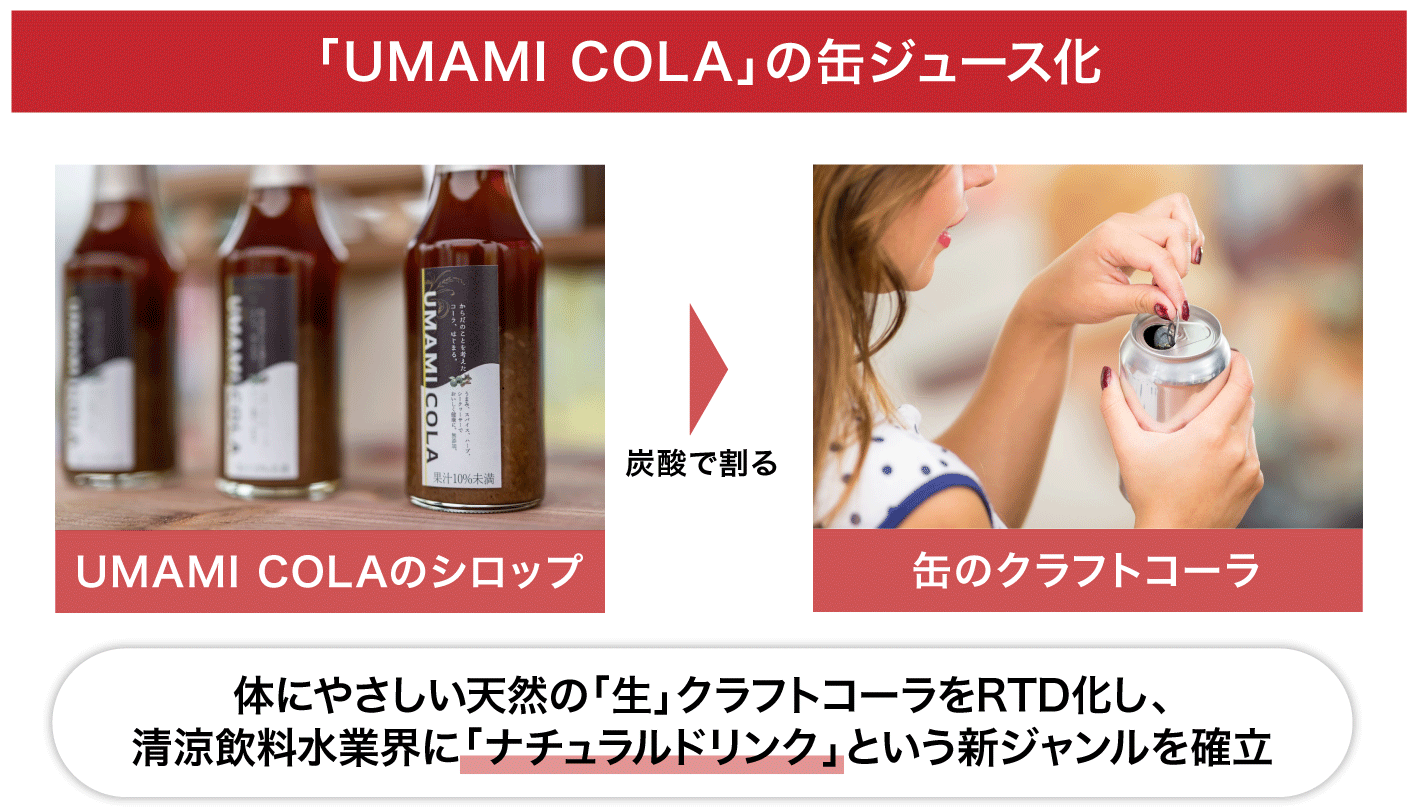 弊社は、「UMAMI COLA」シロップを炭酸で割り、RTD(缶ジュース)化することで清涼飲料水業界に「ナチュラルドリンク」という新たな選択肢を提案したいと考えています。