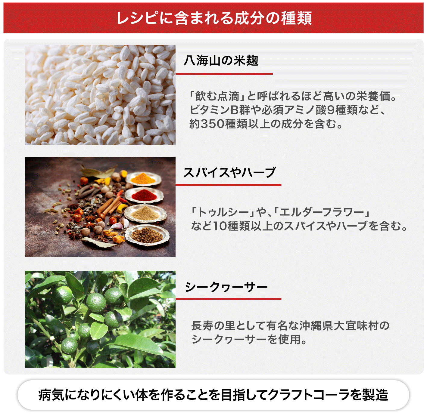 「UMAMI COLA」は、病気になりにくい体を作ることを目指して、安心して飲んでもらえるクラフトコーラがコンセプトです。そのため、甘みの基に米麹で作られた甘酒を使用しています。米麹は、ビタミンB群や必須アミノ酸9種類など、約350種類もの成分が含まれるその栄養価の高さから「飲む点滴」「飲む美容液」といわれています。