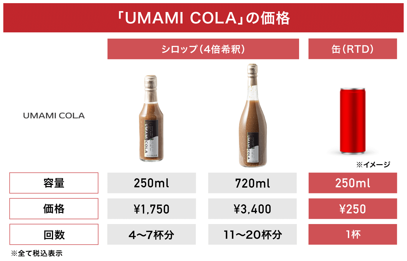 「UMAMI COLA」シロップの価格は、250mlのMサイズが1,750円(税込)、720mlのLサイズが3,400円(税込)となっています。一方で缶の「UMAMI COLA」の価格は他社の清涼飲料水にできる限り近づけ、250mlを250円前後(税込)で販売することを想定しています。