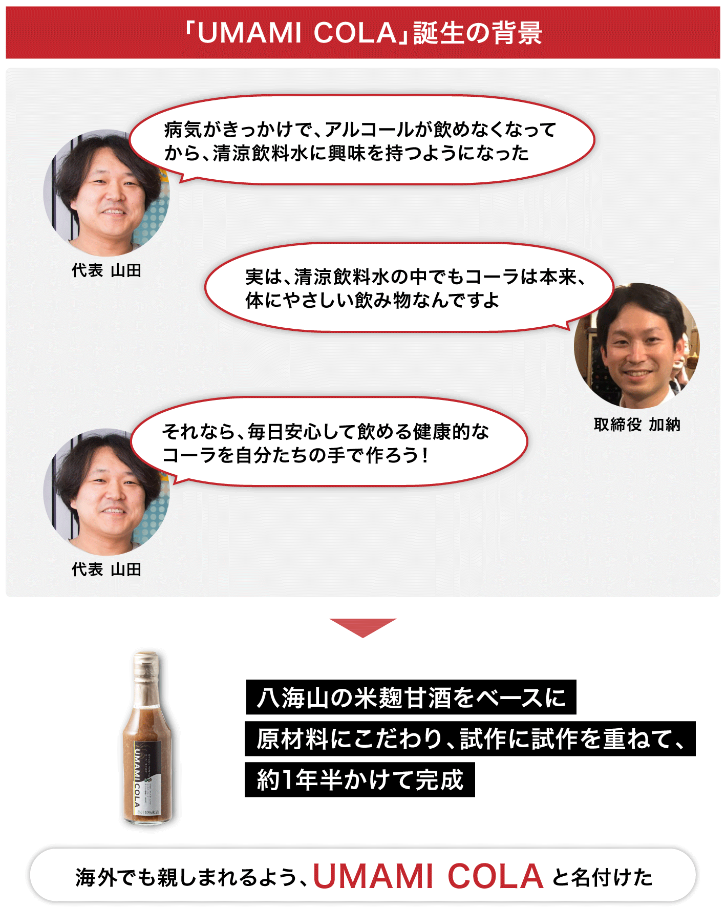 これこそがUMAMI COLAの最大の強みであり、健康意識が高まる昨今で、今後の需要拡大の可能性を強く感じるポイントである。