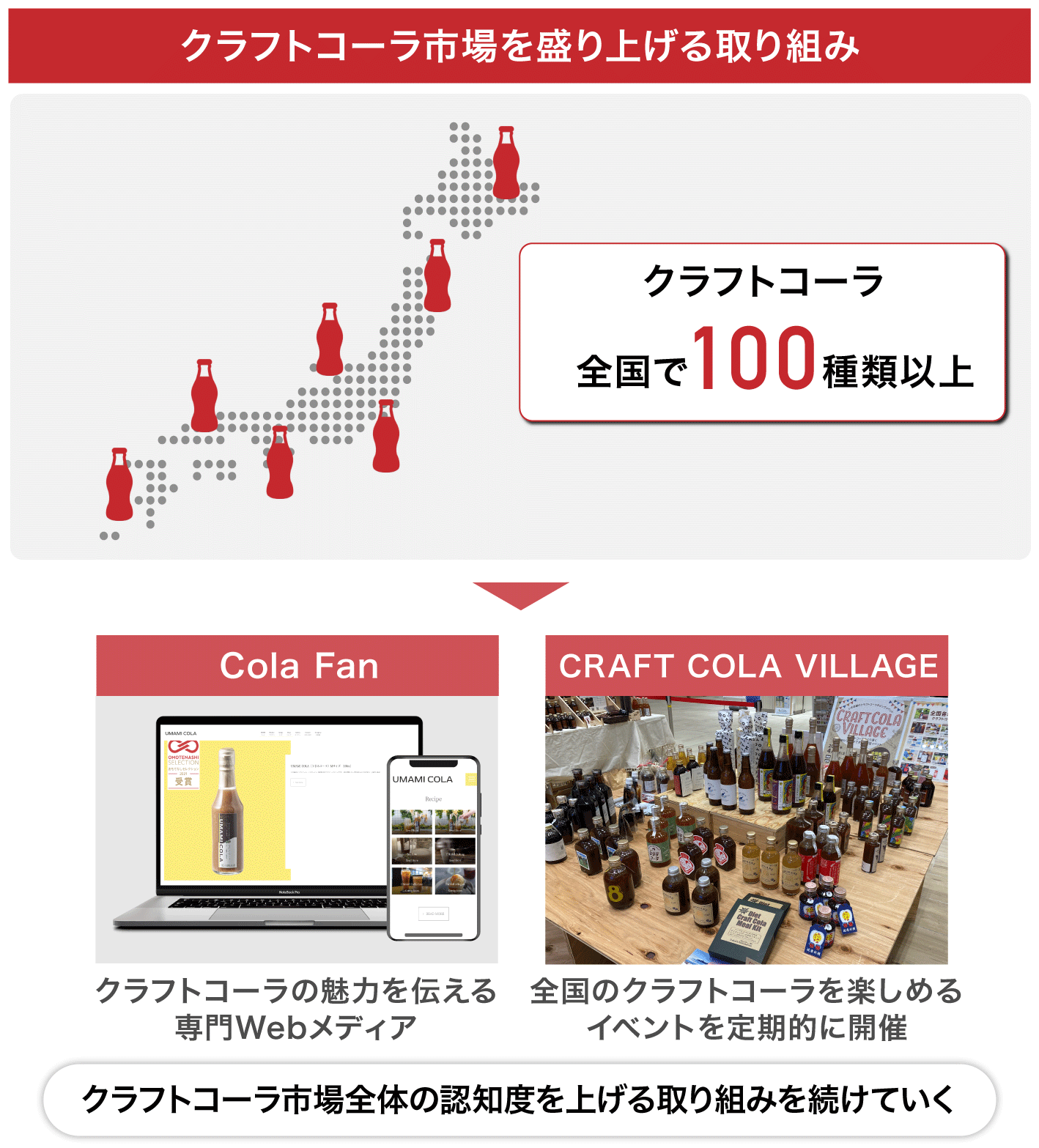 弊社はこれまで、全国約40種類のクラフトコーラを楽しめるイベント『CRAFT COLA VILLAGE』を主催し、クラフトコーラの専門Webメディア『Cola Fan』を運営するなど、クラフトコーラの認知度や地位の向上に努めてきました。