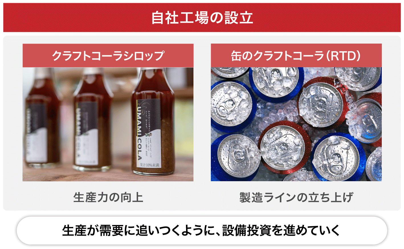 これまで「UMAMI COLA」のシロップ生産は、契約工場に委託して行ってきました。現状の生産スペックは月に数千本の製造が限界であり、現在は予約販売のみで完売するなど需要に追いついていない状況です。そのため弊社は、RTD化を機に自社工場を設立し、シロップの生産力向上と缶の製造ライン立ち上げを行う計画です。