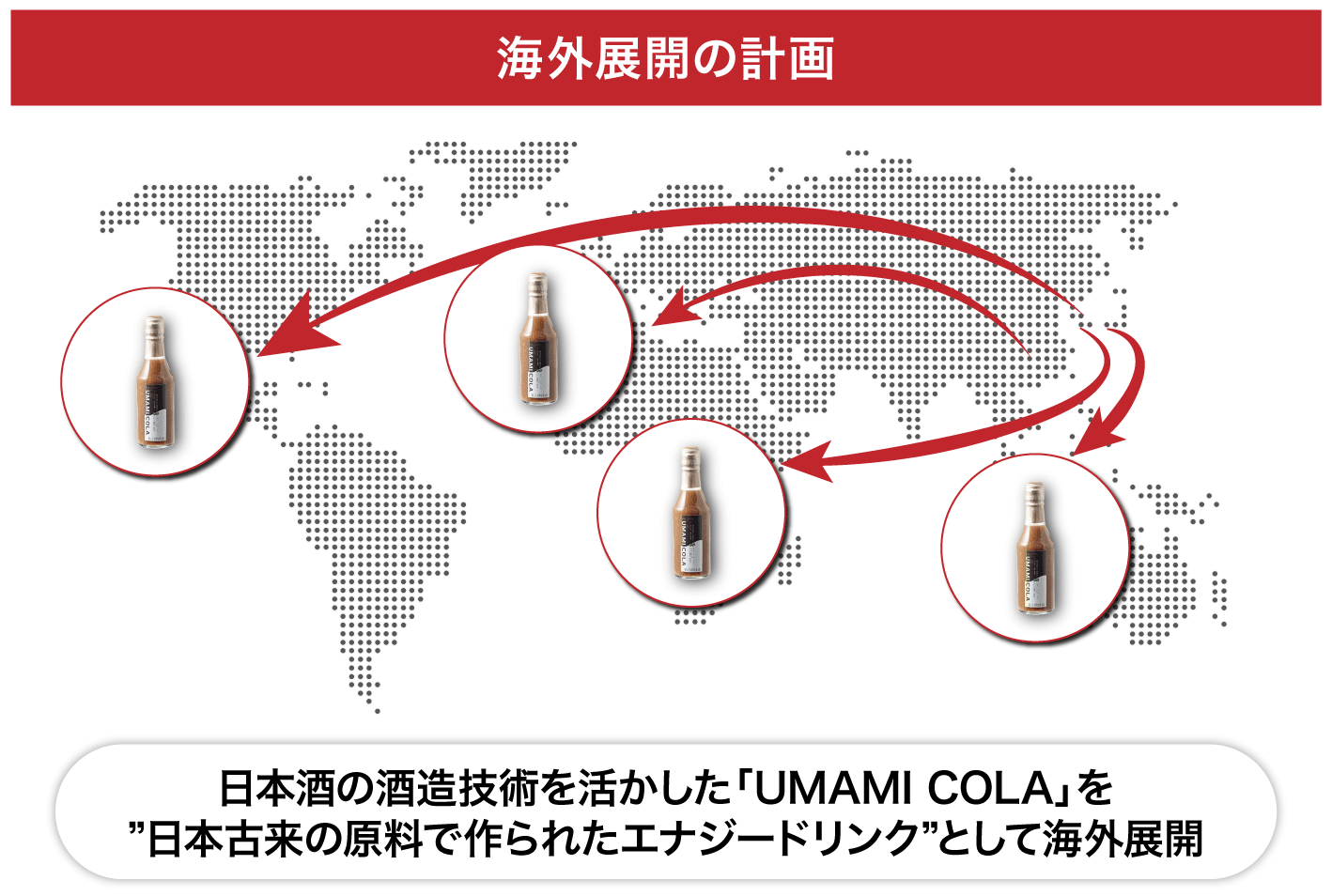 弊社は、「UMAMI COLA」を通して人々に健康を届けたいと考えています。そのため、国内市場の拡大はもちろん、海外展開も想定しています。日本酒の銘醸(特に厳選した原料で清酒を醸造したもの)を手がける酒造独自の技術を活かした米麹がベースの「ナチュラルドリンク」を、日本古来の伝統的なエナジードリンクとして伝えていきます。