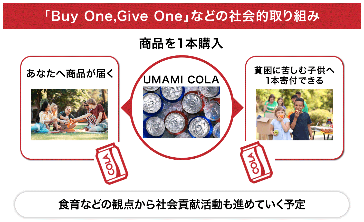 健康分野、スポーツ福祉の分野などに協賛し、「UMAMI COLA」の"美味しく、気軽に、健康に。”というコンセプトを定着させる計画です。