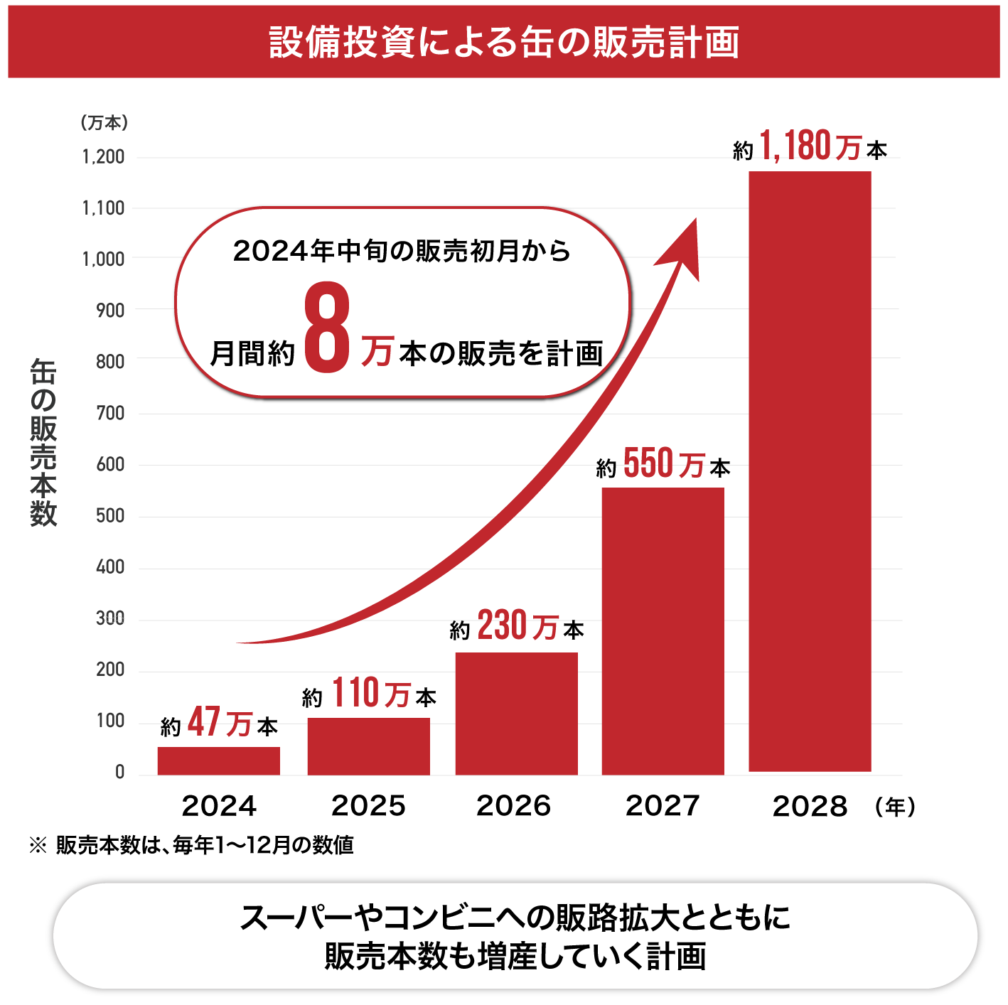 初月8万本出荷、年間47万本の出荷を目指します。