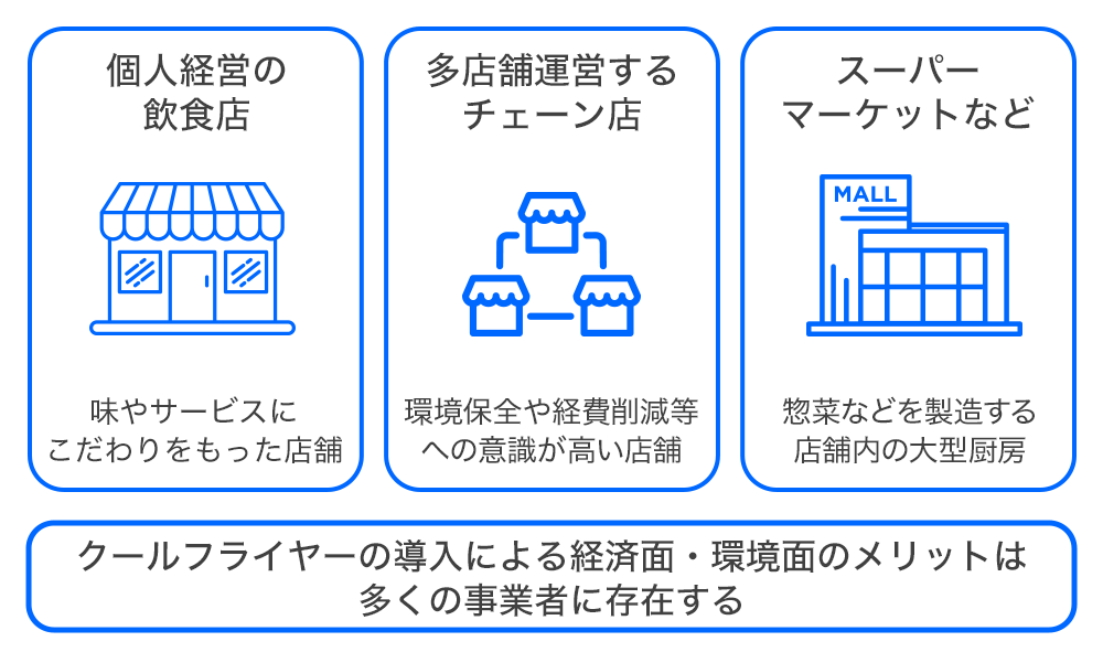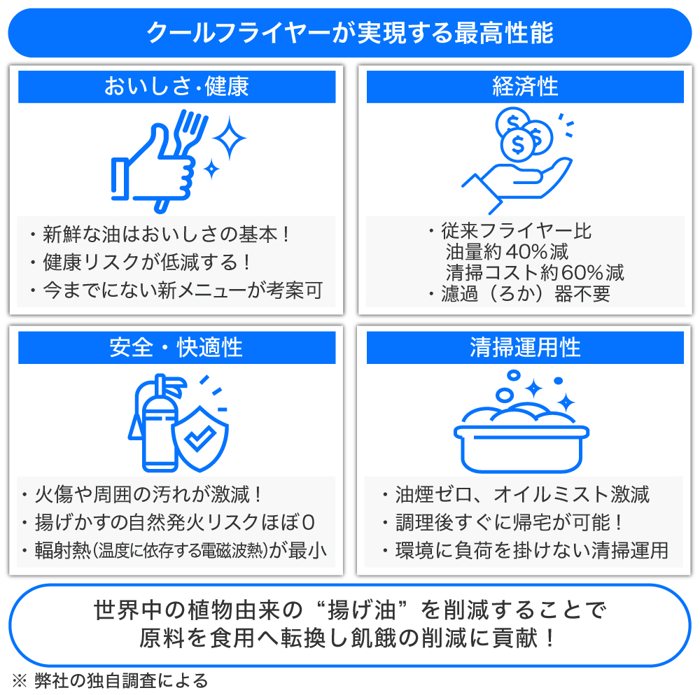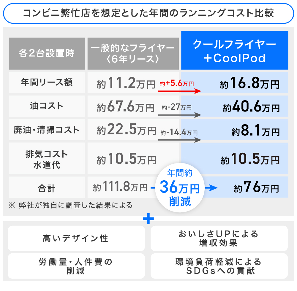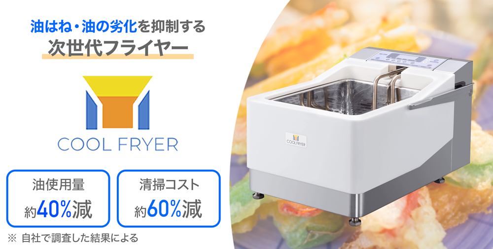 フライヤー自体の料金は割高にも思えますが、「クールフライヤー」は油の節約や清掃業務のコストダウンが期待されるので、導入初月から店舗のコストダウンに寄与し、環境負荷軽減を目指します。