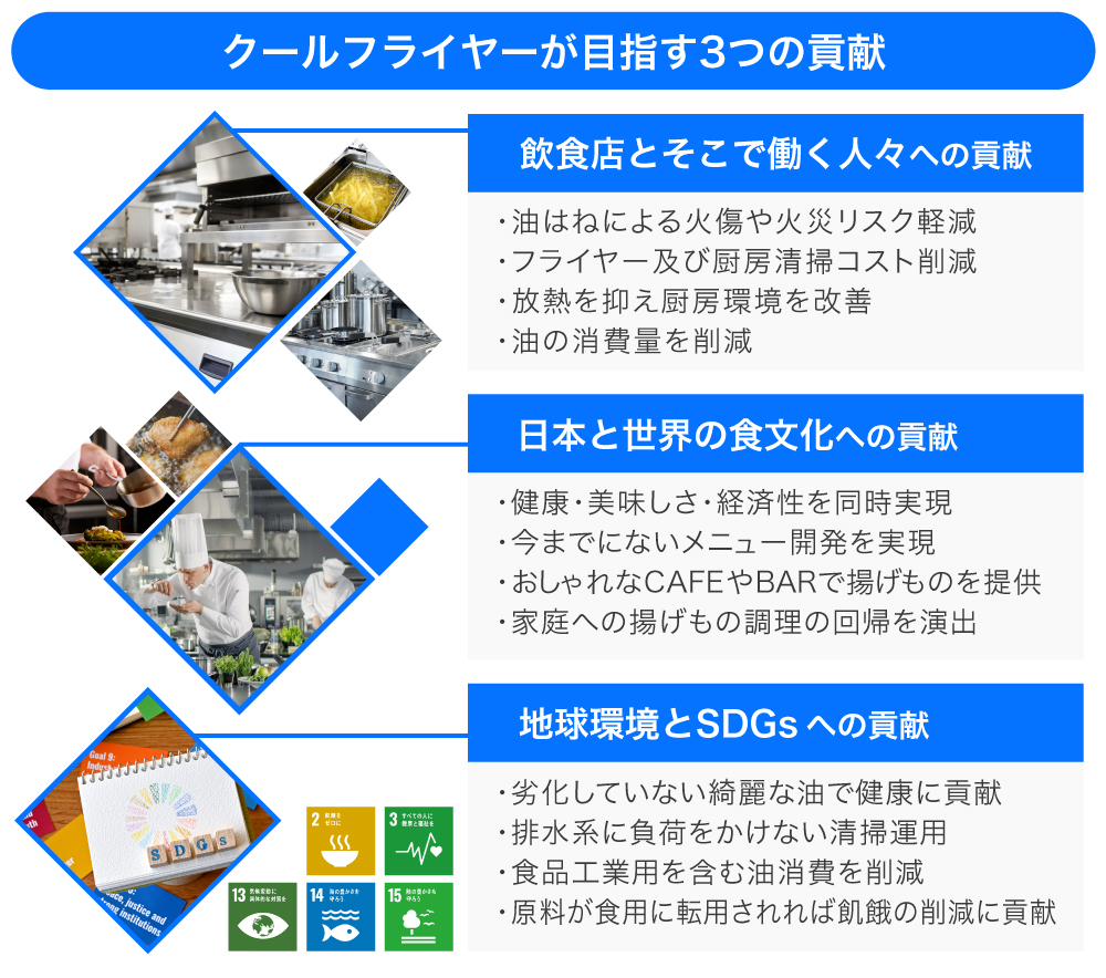 弊社は、これらの課題を解決することで美味しさをUPし、飲食店の厨房の労働環境を改善し、コスト改善に貢献し、揚げもの文化、ひいては食文化の発展とSDGsに貢献できると考えています。