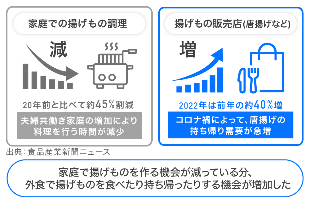 家庭での揚げものの調理機会が低下した分、外食及び中食で揚げものを楽しむ傾向にあると考えられます。