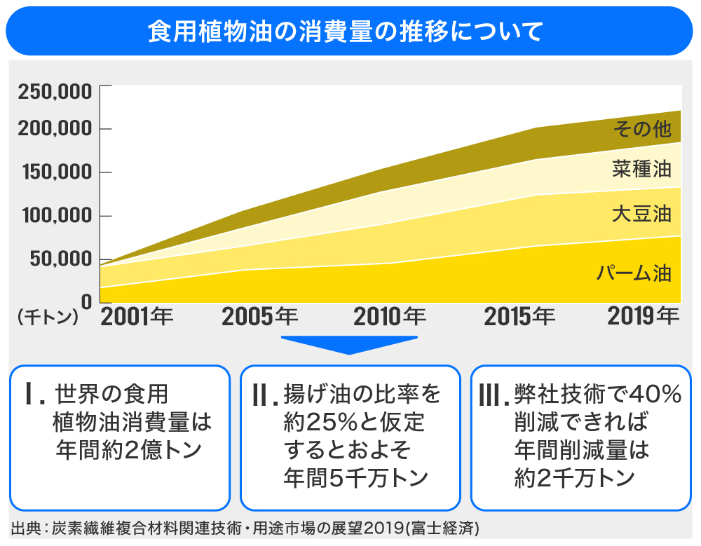 また、世界レベルでも、油の消費量は年々増え続けているため、資源の有効活用・環境保全といった視点から見ても、油の消費量を減らす必要性は高まってきています。