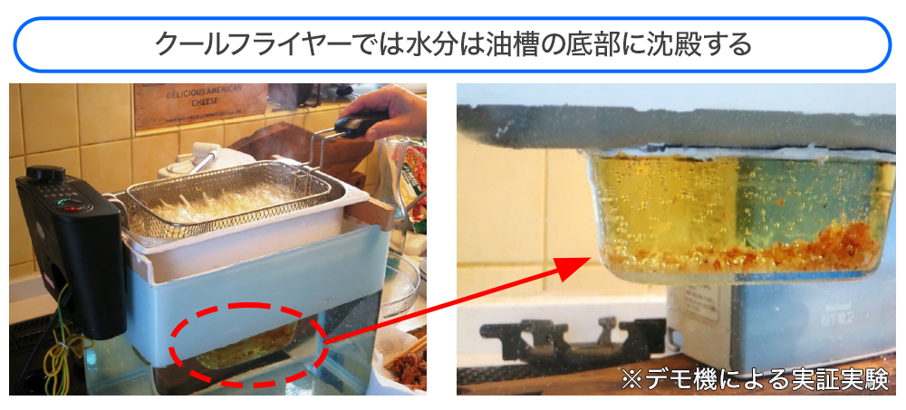 この理由は「クールフライヤー構造」により、水滴は気化せず油中を落下し底部に沈殿するからです(右側の写真で点々と光るものが水滴です)。