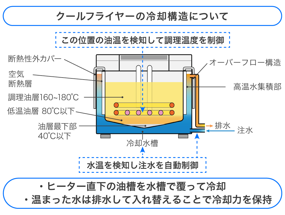 これを実現するため、「クールフライヤー構造」では独自の水冷構造により油槽の最深部を40℃程度までに保ち、食材から発生した水滴や揚げカスの多くを底部に沈殿させています。