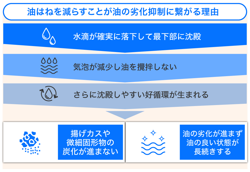 気化の減少により揚げカスが油中を長時間漂わず、温度の低い底部に沈殿することで炭化が進行せず、油の劣化が進行しません。