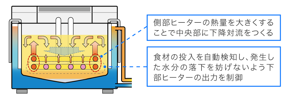 この下降対流に乗って、水滴や微細な揚げカスが落下・沈殿しやすくなります。さらに食材が投入されたことを自動で検知し、下降対流を確かなものにするための加熱制御を行っています。この技術は3件目の特許として取得しています。