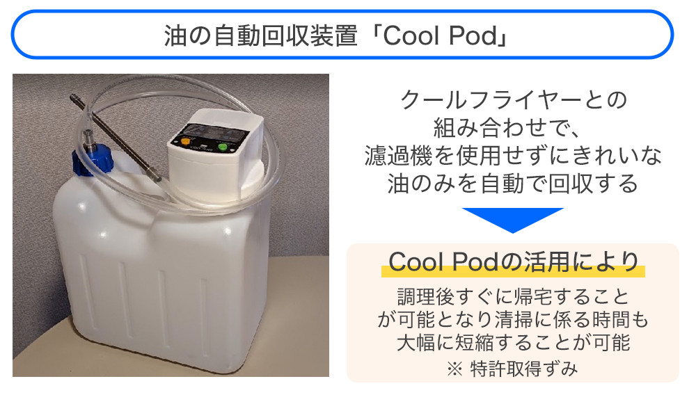 また、再使用できるきれいな油のみを回収できる技術も開発し、濾過機も不要で、清掃や油の交換を合計数分で済ませることができます。