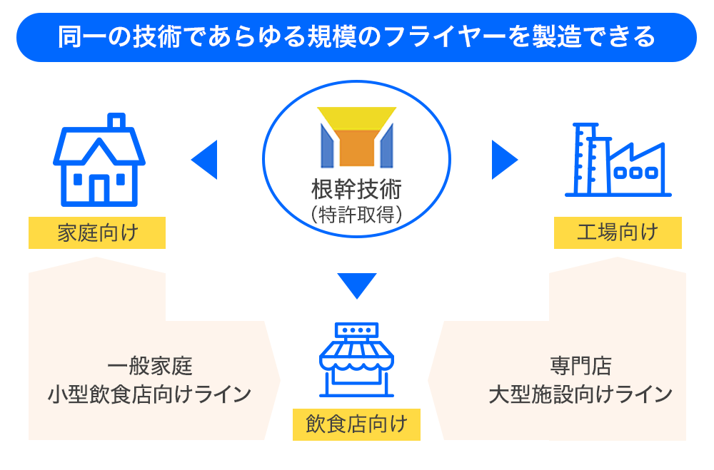 「クールフライヤー」の特長の一つは、小さな家庭用フライヤーから、食品工場で使用するような巨大なフライヤーまで同一技術で製品化が可能であることです。