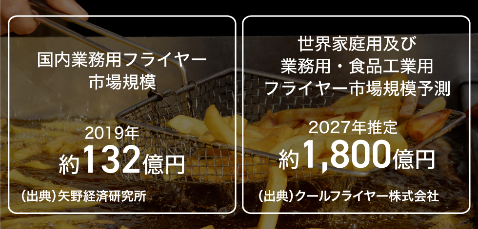 国内の業務用フライヤー市場規模予測は、推定約132億円と言われています( 出典:矢野経済研究所)。一方、世界規模で見た際に家庭用及び食品産業用を含めると、その市場規模は約1,800億円まで拡大すると推定しています(弊社の独自調査による)。