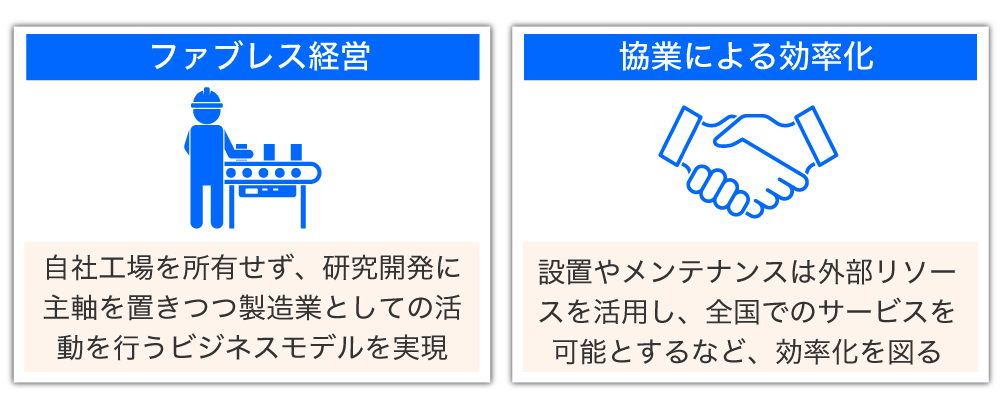 また、開発から基本設計までの根幹部分を社内で実施し、製造やメンテナンス対応などは専門企業と協業する体制を整えています。