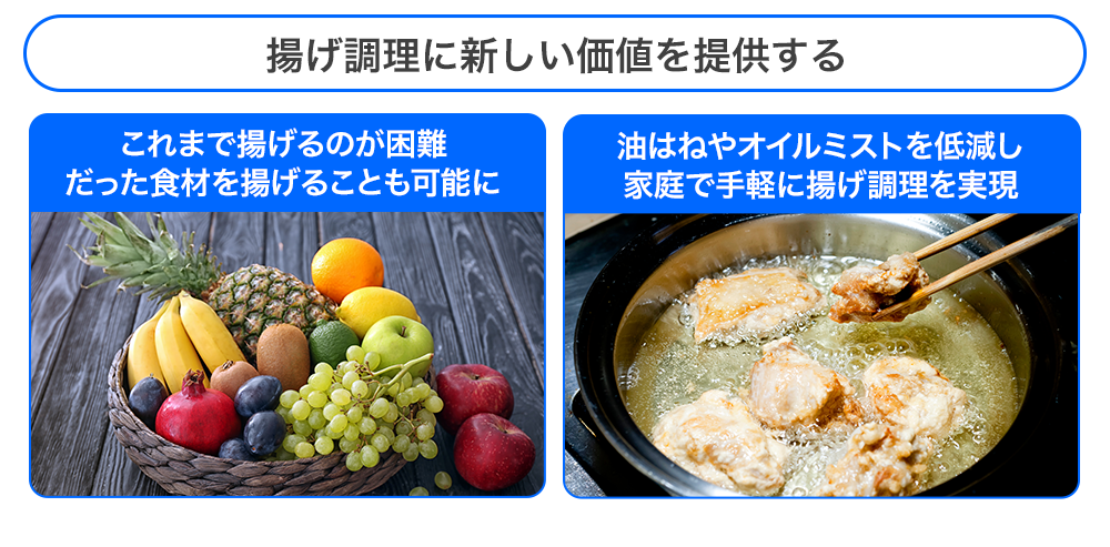 揚げ調理には数千年と言われる歴史がありますが、熱した油に水滴が入れば跳ねるものと誰もが疑わず、諦めてきました。