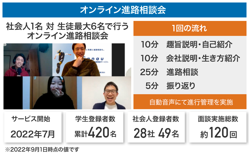 現役の中高生が、将来の進路を検討する際に、オンラインで様々な業種の社会人と直接進路相談ができるサービス「canau(カナウ)」を2022年7月にリリースしました。